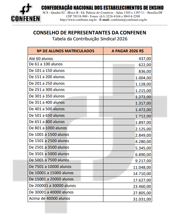 É preciso reconhecer que somente com a soma de forças a CONFENEN terá melhores condições de trabalho em defesa da importante categoria. A contribuição sindical está para a entidade sindical, assim como a mensalidade do aluno está para a escola, sendo indispensável constar o código sindical da CONFENEN no boleto (015), para evitar que parcelas da contribuição sejam indevidamente redirecionadas.